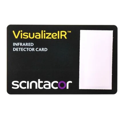 UV material maximum stimulation: 7ns, nitrogen @ 337nm 130 mW/cm2 (single pulse) IR material maximum stimulation: Nd:YAG 60MW/cm2 @ 1064nm (7ns pulse – single pulse).. Laser Alignment Detector Cards. The Visualize series from Scintacor are laser alignment tools. The range includes the standard Visualize series for detecting visible radiation, VisualizeIR series for IR radiation and UVisualize for UV radiation. Visualize products utilise a phosphor scintillator screen mounted in a black plastic, non-reflective housing. The detectors work by converting UV and IR light into visible light for laser safety. Laser alignment cards are a credit card sized tool with a 4.5cm² active area. Their compact size makes them portable and therefore ideal for checking different laser beam paths. The Visualize laser detector cards are available in UV, visible and NIR options.. Absorption bands Visualize: 400-640 nm / 800-1700 nm VisualizeIR: 790-840 nm / 870-1070 nm / 1500-1590 nm UVisualize: 250-540 nm