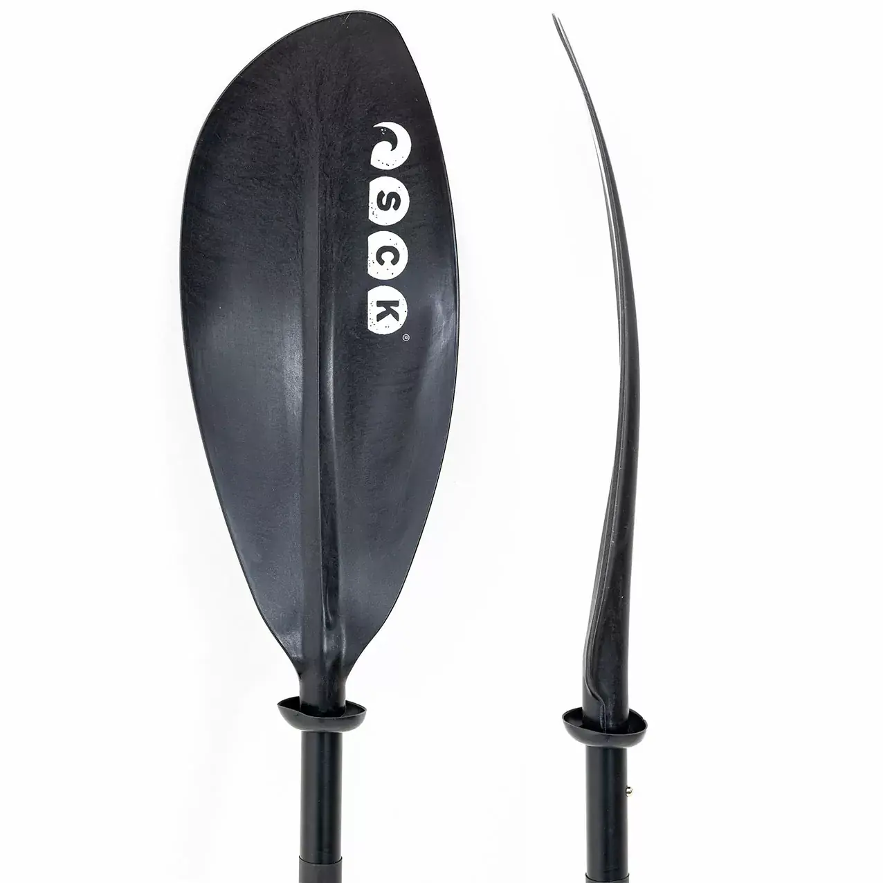 A durable high angle paddle with reinforced fiberglass polypropylene blades and aluminum shaft.
