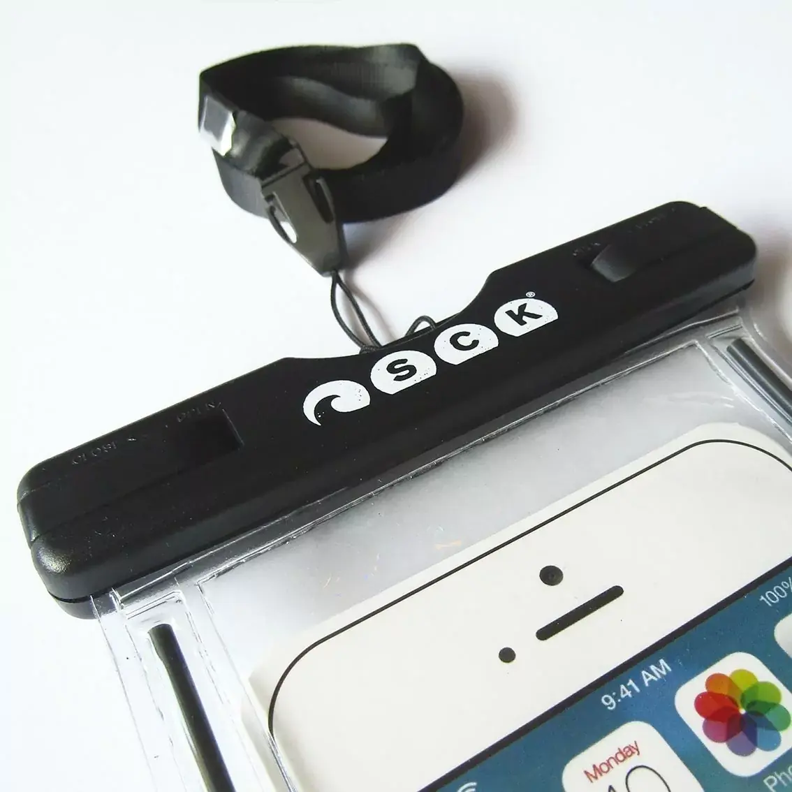 PVC 100% waterproof phone case with safety closure and removable strap.