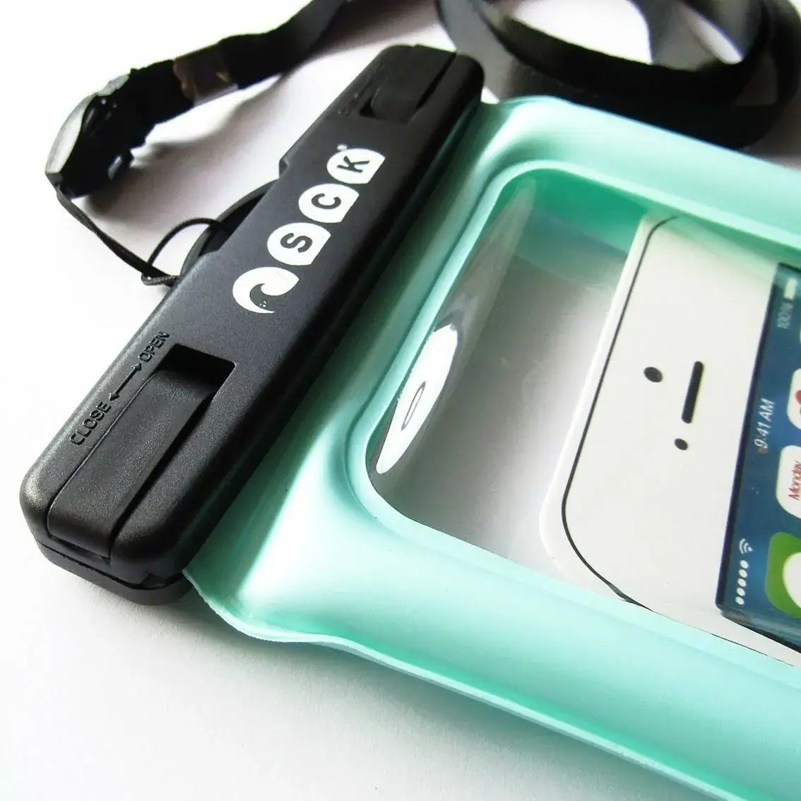 PVC 100% waterproof phone case with safety closure, removable strap and floating frame.