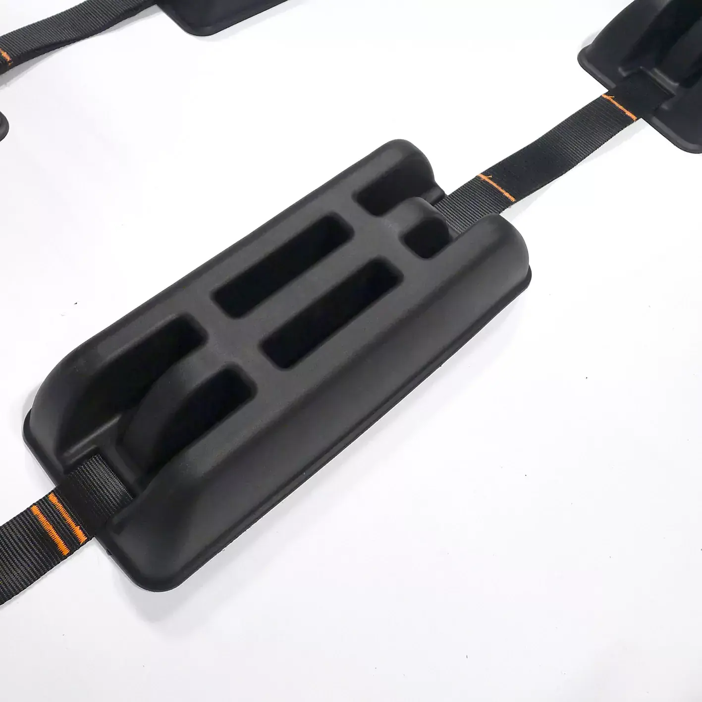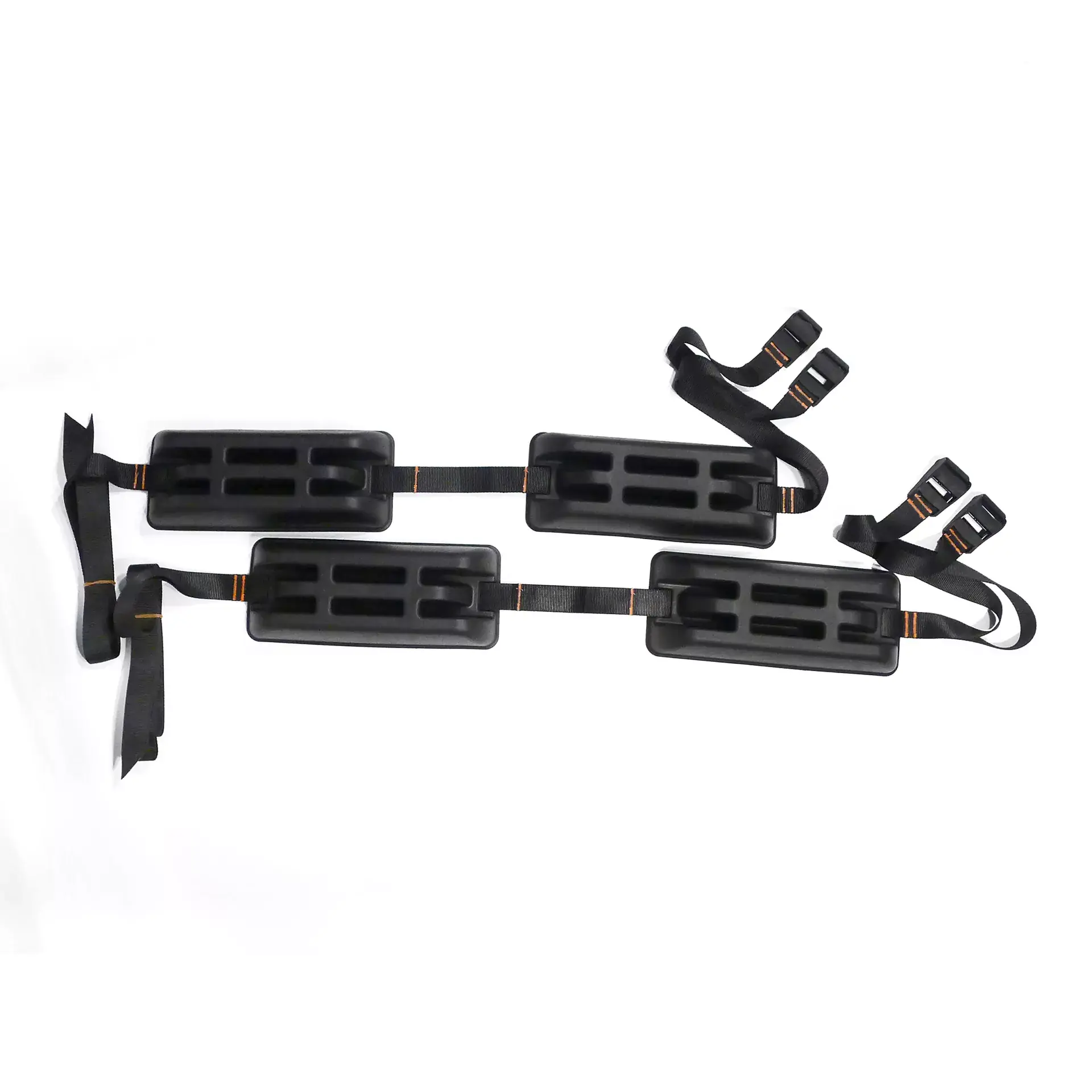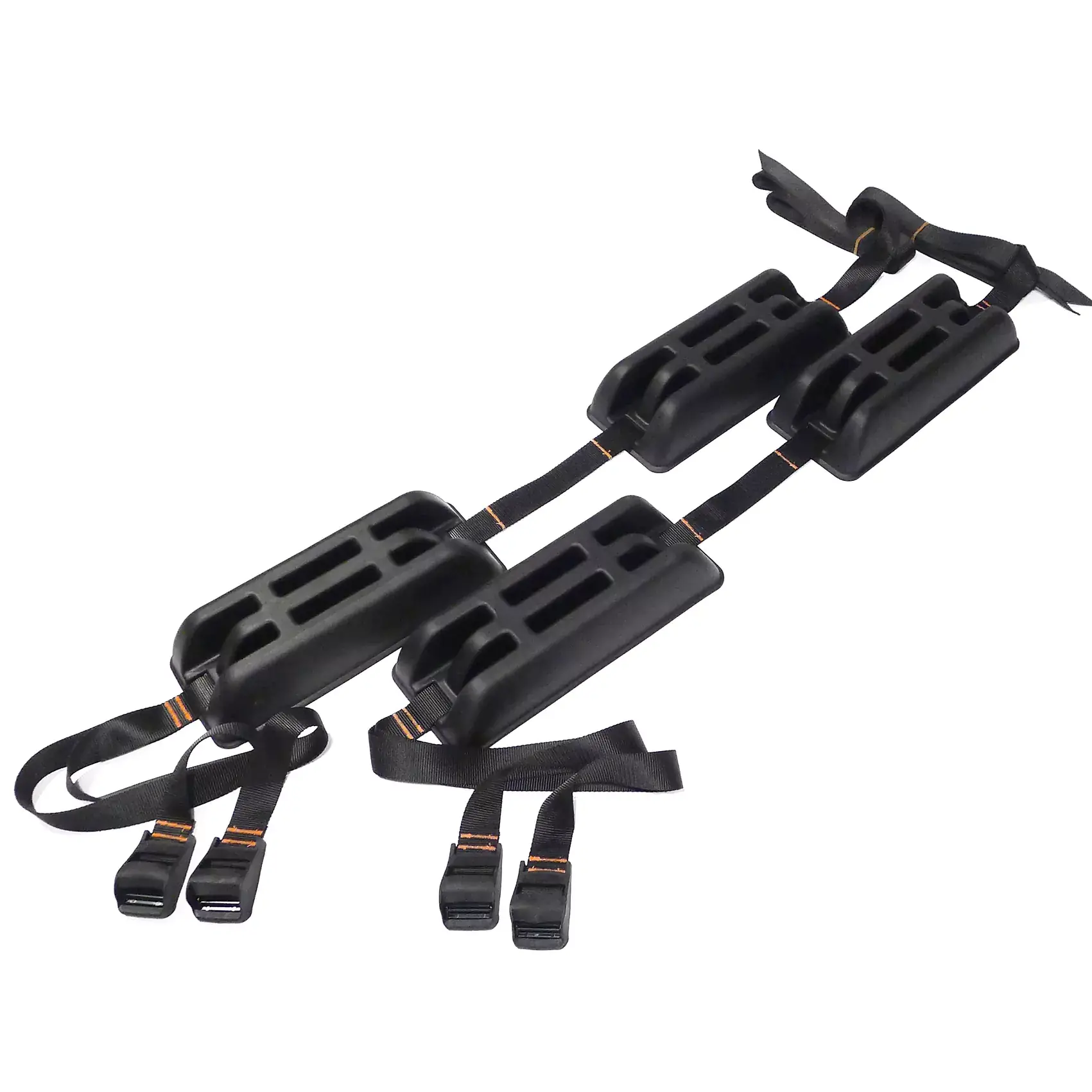 Straps for tying the product are included. The straps are attached to the rack set, simply place the canoe/kayak/SUP/surf or whatever, bring the straps over the product and pass one end through the buckle. Pull until it is tight enough to keep the product from moving.
