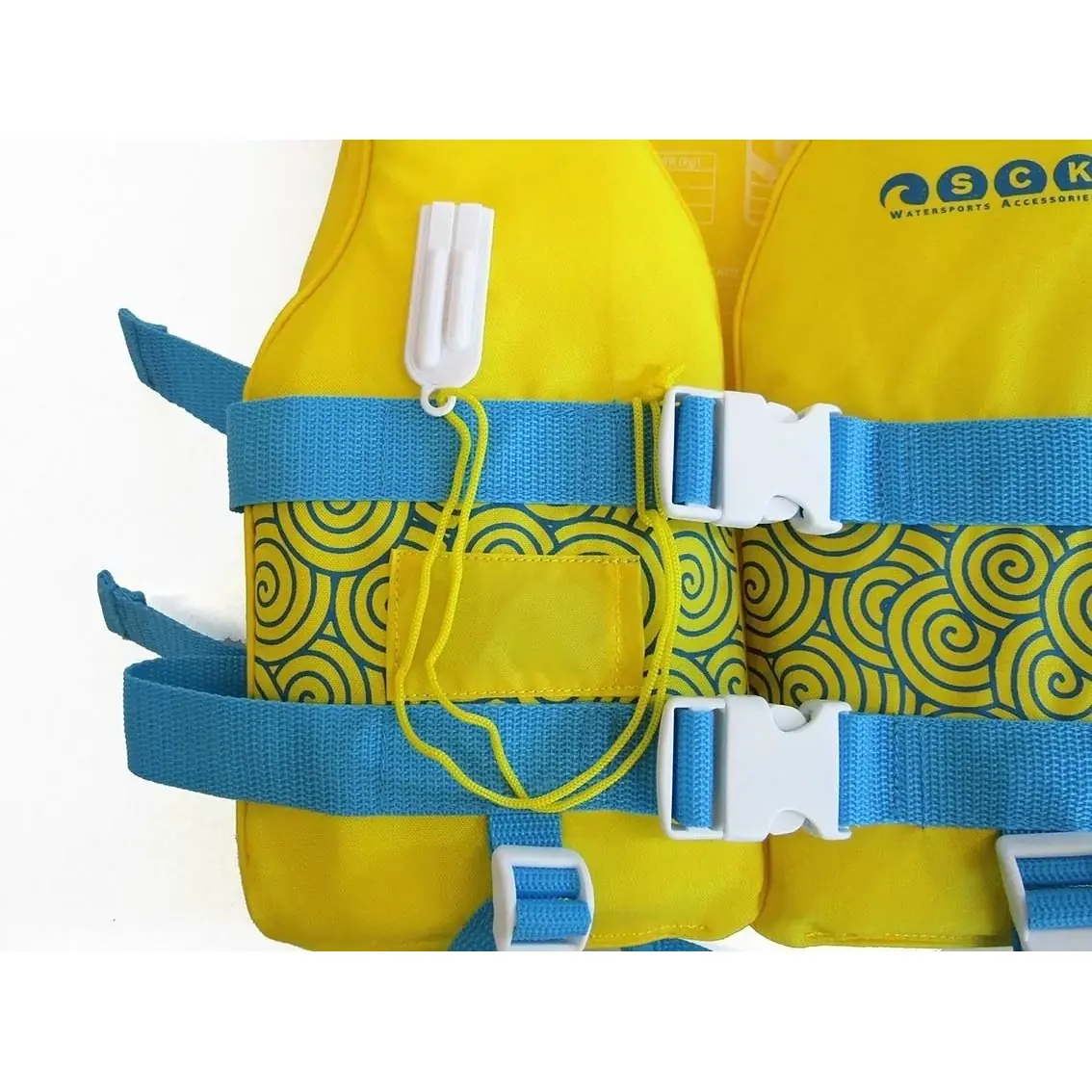 Suitable for water sports as it provides maximum safety and comfort thanks to the opening on the sides. It closes and adjusts with 2 straps in the waist. It also has straps that goes under the feet that are made to keep the jacket in place. It has a head support, that will keep the child's head out of the water in case of need.