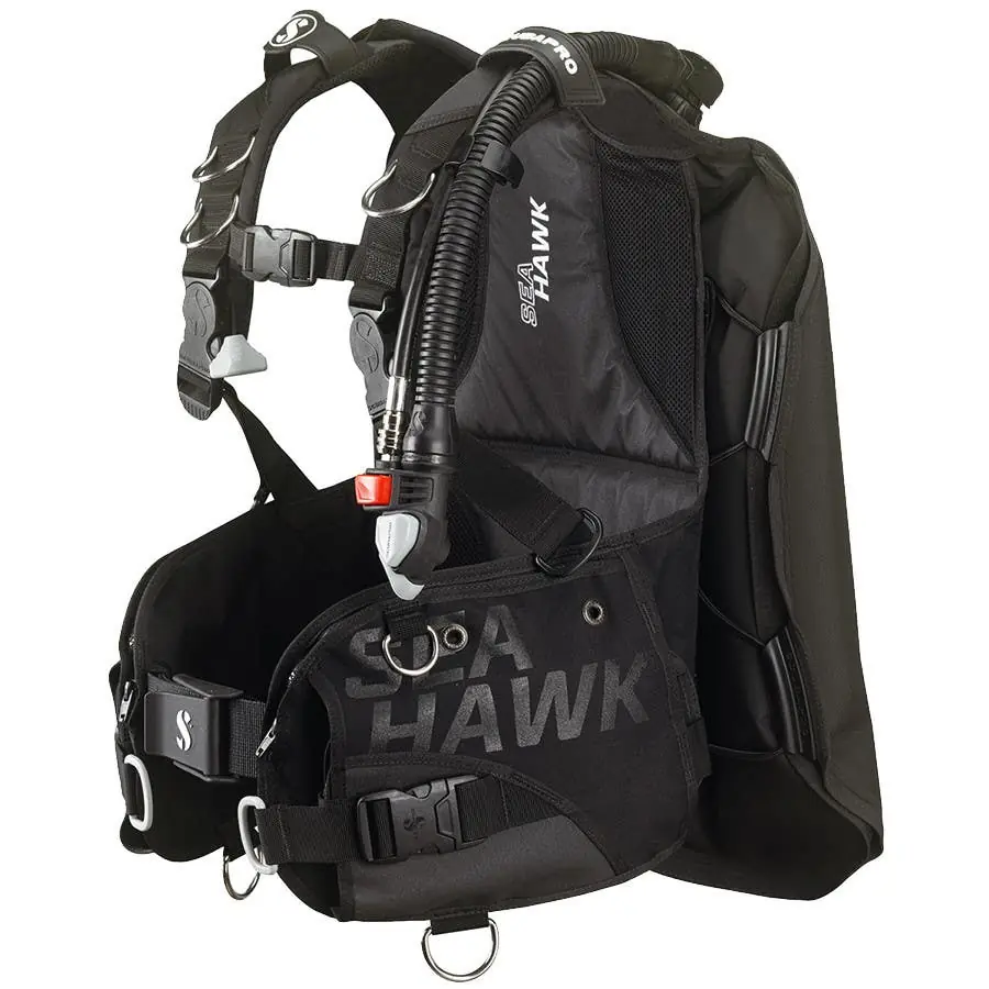 The Seahawk 2 BCD is an all-purpose back-inflation buoyancy control device designed for divers seeking freedom of movement, comfort, and stability. It features an ergonomic shoulder design with rotating buckles, a reinforced soft backpack, and a Super Cinch stainless steel tank band system. The BCD offers a streamlined shape when deflated and substantial buoyant lift when inflated, making it suitable for various diving conditions.