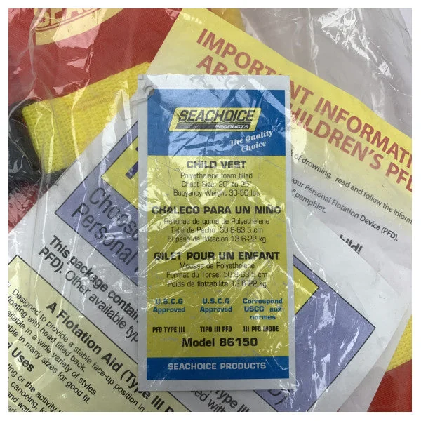 The Seachoice 86150 Deluxe life jacket is specially designed for children weighing between 14 and 23 kg (30-50 lbs) with a chest size of 50-63 cm (20-25 inches). This stylish orange/yellow jacket is not only safe but also comfortable thanks to its lightweight design and soft lining.