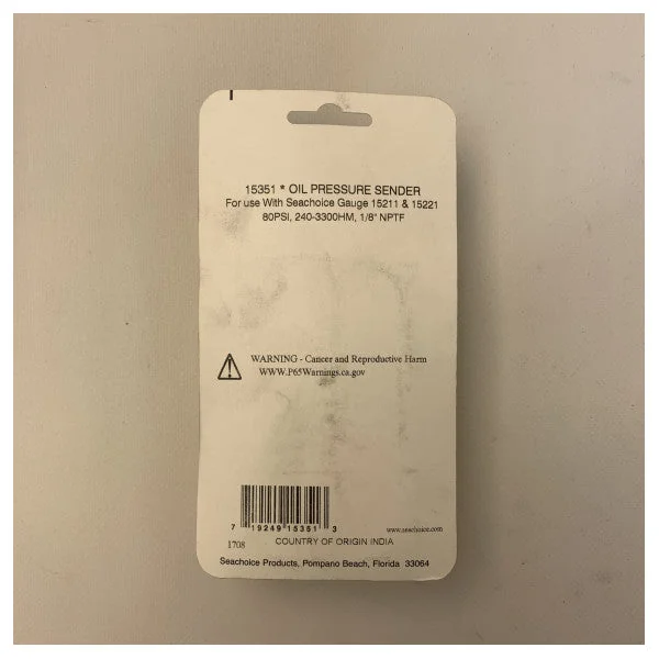 The Seachoice Oil Pressure Sensor is an essential component for monitoring the oil pressure in your boat's engine. With a maximum pressure of 80 PSI and a resistance range of 240-330 OHM, this sensor provides accurate readings for optimal engine performance and protection.