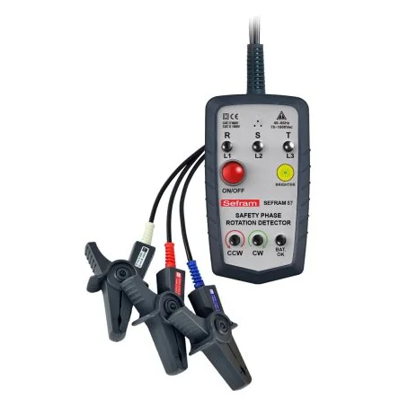 The Sefram rotary phase tester. This non-contact phase sequence tester has been designed according to the standards in force and is CE compliant and complies with the requirements of the international standard IEC / EN 61010-1.Automatic shutdown (after about 5 min) Alligator clips, without direct electrical contact with the phases