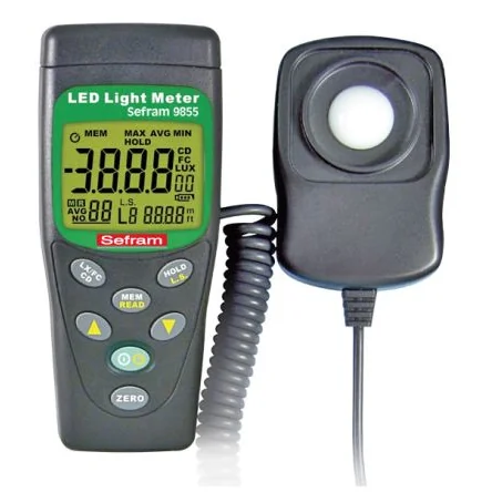 The Sefram digital lux meter for LED lamps calibrated for the light from white LED.Measurement on 5 ranges from 40 to 40000 lux Resolution up to 0.01 lux Ranges automatic or manual Deported sensor with cable coiled for an optimal position Functions: Max, Min, Avg, Hold Memory storage of 99 measures Calibrated for the light from white LED Measures can be done to natural or incandescente light Auto power-off Supplied in a case