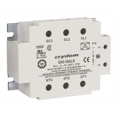 UL, CSA, TUV. Heat sink not included. For load current de-rating and heat sink details see manufacturers datasheet. GN3 Series Three Phase Relays. The GN3 series consists of three solid-state outputs controlled by one input, and functions similar to any standard solid-state relay. When the input signal is applied, each output conducts load current for it's respective phase in the network. Features and Benefits. DBC substrate for superior thermal performance Epoxy-free design reduces internal component stress Back-to-Back dual SCR output for heavy industrial loads Zero crossing output Snubber circuit 100k-cycle UL508 endurance rating for enhanced reliability No external transient protection required (internal TVS) EMC Compliant for reliable operation in harsh environments