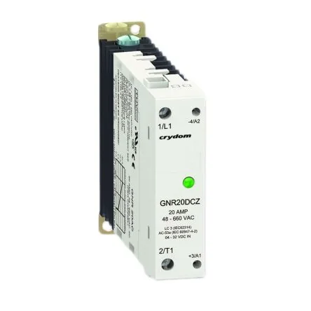 Crydom GNR 22.5mm Series Solid State Relays. Crydom GNR 22.5 mm series robust and versatile general purpose AC and DC panel mount solid state relays. These powerful single phase SSRs have superior thermal performance thanks to the use of DBC technology. The GN series solid state relays feature anti-rotation barriers, flexible control voltage options, LED input status indicator, overvoltage protection (on all AC output relays), and a wide range of power ratings. Features and Benefits. Direct Bond Copper (DBC) Substrate. LED input status indicator. UL 508 Endurance rating for enhanced reliability. UL/CSA Approved, CE Compliant. Built-in overvoltage protection. DIN Rail or Panel Mount. Zero voltage or instantaneous turn-on output