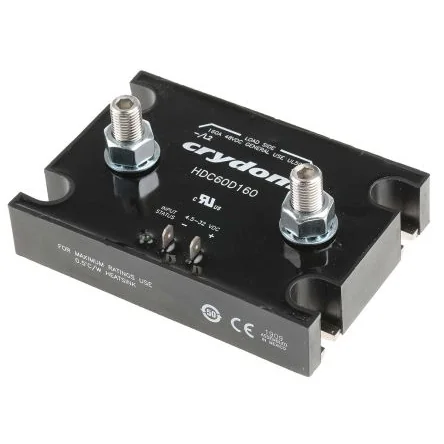 Panel Mount Solid State Relays- HDC Series. The H16WD series from Crydom offers a panel mounting solid state relay with current ratings of 120A to 160A @ 72 Vdc. These solid state relays are designed for control of high power DC loads such as coils, clutches, motors, and solenoids and can be used in a variety of applications including packaging, machinery, power supplies and process controls. The HDC series of solid state contactors are housed in a compact, robust industry standard 75x105mm panel mount package and are suited to harsh environments. Single pole single throw normally open operation LED status Indicator Heavy duty stud terminals Low on-state voltage drop