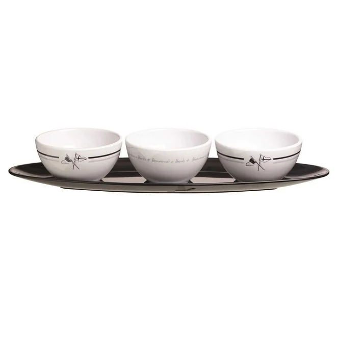 Set of 3 snack bowls with rectangular underplate with Welcome On Board decoration.
