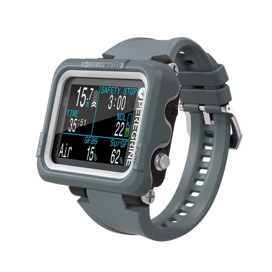The Shearwater Peregrine Adventures Edition Dark Dive Computer is a versatile and user-friendly device designed for divers of all levels. Featuring a high-resolution, full-color LCD screen, it offers clear and customizable display options. The intuitive two-button interface ensures easy navigation through various dive modes and settings. Powered by a rechargeable Li-ion battery, it provides up to 30 hours of operation at medium brightness and supports wireless charging for convenience. The Peregrine supports multiple dive modes, including Air, Nitrox (up to 40%), and 3-gas Nitrox (up to 100% Oâ‚‚), catering to both recreational and technical divers. Its ergonomic design, combined with robust materials, ensures durability in diverse underwater environments. Wireless connectivity allows for seamless data management via the Shearwater Cloud app, enhancing the overall diving experience.