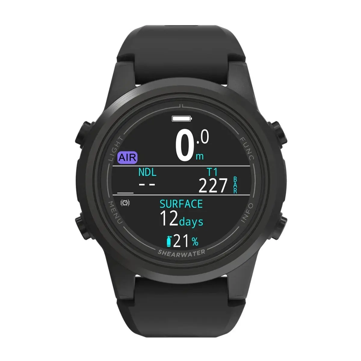 The Shearwater Tern TX Dive Computer Watch is a compact and versatile device designed for sport and recreational divers seeking reliability and ease of use. It features a high-resolution 1.3-inch AMOLED display, providing exceptional visibility underwater. The Tern TX supports multiple diving modes, including Air, Nitrox, 3 Gas Nitrox, Gauge, and Freedive, catering to various diving preferences. It offers wireless air integration, capable of connecting with up to four Swift gas pressure transmitters, allowing real-time monitoring of gas pressure data. The integrated 3-axis digital compass with tilt compensation ensures accurate underwater navigation. The device is depth-rated to 120 meters and equipped with a rechargeable battery offering up to 20 hours of autonomy. The Tern TX is designed and built in Canada, reflecting Shearwater's commitment to quality and innovation.