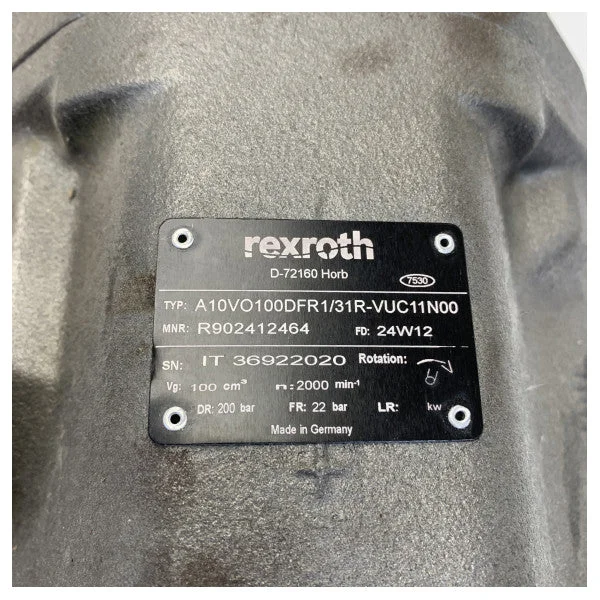 This Axial Piston Pump (A10VO100dFR1 31R) has a geometric volume of 100 cubic centimeters (100 cm3) per revolution, providing excellent hydraulic flow. The pump is designed to handle a maximum operating pressure of 200 bar, making it suitable for the most demanding tasks. The model number A10VO100dFR1 31R confirms the specific version of the Rexroth A10VO series, known for its variable displacement and robust construction. The designation '31R' indicates the series and rotation direction, which is essential for correct installation. The pump offers a dynamically efficient operation due to its variable design, leading to lower energy consumption and better system response.