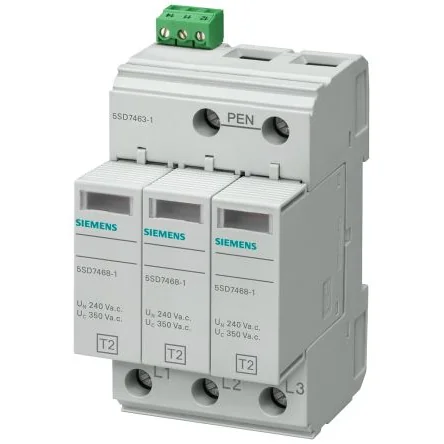 The Siemens 5SD series is a surge arresters,type 2 with requirement class c and Pluggable protective modules. 3+0 circuit for TN-S and TT systems with remote display.It has Protection class rating of IP20 Type of distributive system is TT,TN-S