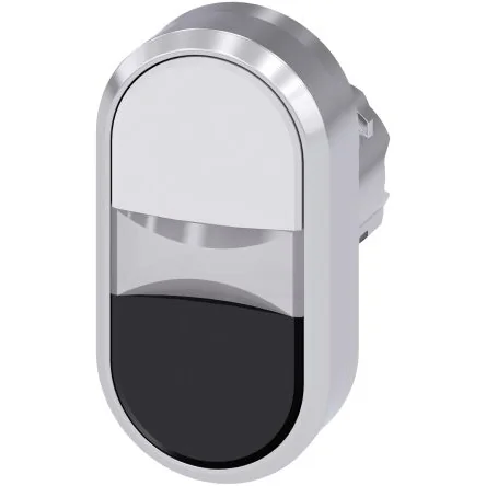 Under the brand name SIRIUS ACT, Siemens offers a unique portfolio of pushbuttons and signaling devices with global product approvals in four modern design lines of rugged genuine metal and high-grade plastic. An innovative snap-on concept makes the task of installing a unit so easy that it can be done with one hand and without any special tools. Groove-free holes are adequate as mounting holes since full twist prevention is already integrated. Thanks to the high degree of protection throughout, the rugged devices are suitable for use in industry and outdoors. Even cleaning with a high-pressure jet is possible. Neither dust, oils, nor caustic solutions can interfere with reliable operation. As well as standard wiring, the devices can also be connected to the controller via PROFINET, AS-Interface or IO-Link. Doing so will help you to reduce wiring time and effort, minimize error sources and have more flexibility. The graphical Online Configurator provides convenient support when selecting and ordering individual devices, enclosures and labels. Extensive documentation (e.g. manual, 3D data, terminal diagram) is available. Note: Single device, please order holders and modules separately.Illuminated twin pushbutton, 22 mm, round, metal, shiny, white, black, pushbuttons, flat