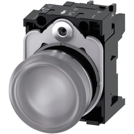 Under the brand name SIRIUS ACT, Siemens offers a unique portfolio of pushbuttons and signaling devices with global product approvals in four modern design lines of rugged genuine metal and high-grade plastic. An innovative snap-on concept makes the task of installing a unit so easy that it can be done with one hand and without any special tools. Groove-free holes are adequate as mounting holes since full twist prevention is already integrated. Thanks to the high degree of protection throughout, the rugged devices are suitable for use in industry and outdoors. Even cleaning with a high-pressure jet is possible. Neither dust, oils, nor caustic solutions can interfere with reliable operation. As well as standard wiring, the devices can also be connected to the controller via PROFINET, AS-Interface or IO-Link. Doing so will help you to reduce wiring time and effort, minimize error sources and have more flexibility. The graphical Online Configurator provides convenient support when selecting and ordering individual devices, enclosures and labels. Extensive documentation (e.g. manual, 3D data, terminal diagram) is available. Note: Single device, please order holders and modules separately.Indicator lights, 22 mm, round, metal, shiny, clear, lens, smooth, with holder, LED module with integrated LED 230 V AC, screw terminal