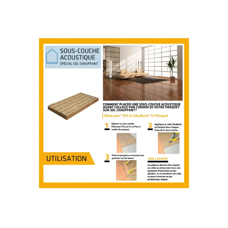 The acoustic underlay SIKA SikaLayer PC3 - 12m2 is designed for gluing parquet onto heated floors in all non-humid rooms allowing the installation of parquet with the UPEC classification defined in article 4 of the DTU 51.2 P1-1 "Glued Parquets". The application is easy and provides good impact noise insulation.