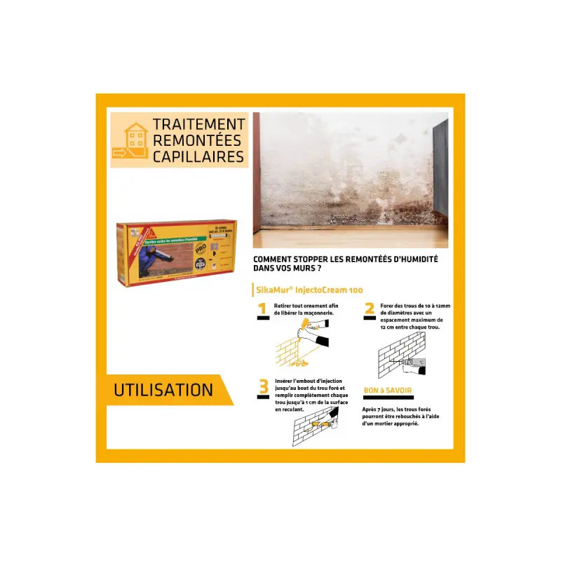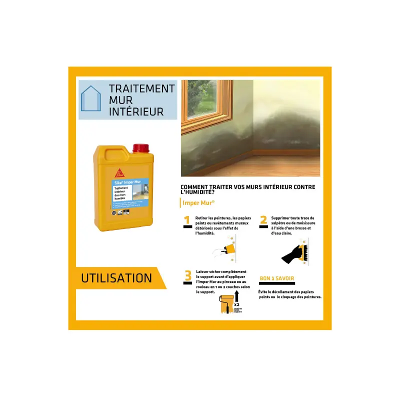This SIKA anti-damp kit - InjectoCream 5m - Imper wall 2L will allow you to control rising damp in both interior and exterior walls as well as treat your damp walls. Inject the InjectoCream product into your damp walls to form a barrier that blocks water and prevents the progression of moisture. Then apply the Imper wall product to treat your damp walls that are prone to peeling wallpaper or paint blistering. These products can be used on almost all types of masonry walls (brick walls, natural stone, hollow walls, buried walls, and rubble walls made of stone and random-shaped rubble).