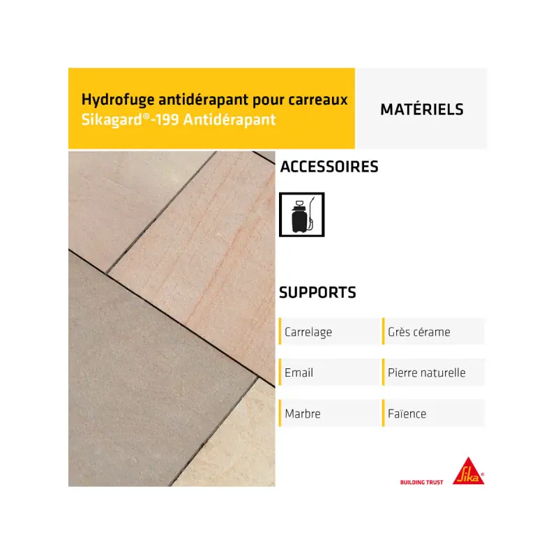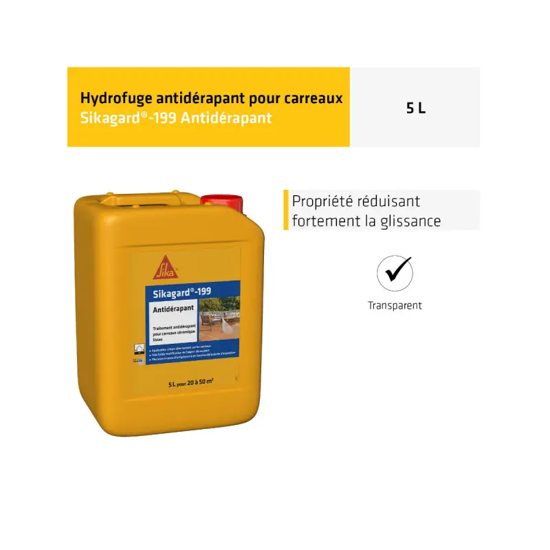 This Sikagard-199 anti-slip is a mineral anti-slip treatment for smooth ceramic tiles. It provides surfaces with a surface and irreversible abrasion of the vitrification of ceramic coatings, significantly reducing slipperiness when wet. This product can be applied indoors and outdoors on all smooth and mineral surfaces (Ceramic tiles, stoneware, enamel, earthenware, natural stone, marble...) It is therefore ideal for treating all areas made slippery in the presence of water: terraces, stair steps, pedestrian access ramps, entrance halls, sports complexes, swimming pool beaches, kitchens, shower trays, bathtubs... However, it must not be used on surfaces treated with linseed oil or with a water-repellent protection, acrylic trays or other resins, varnished paints, PVC, soft floors, wood, natural slate, waxed concrete, quartz concrete...