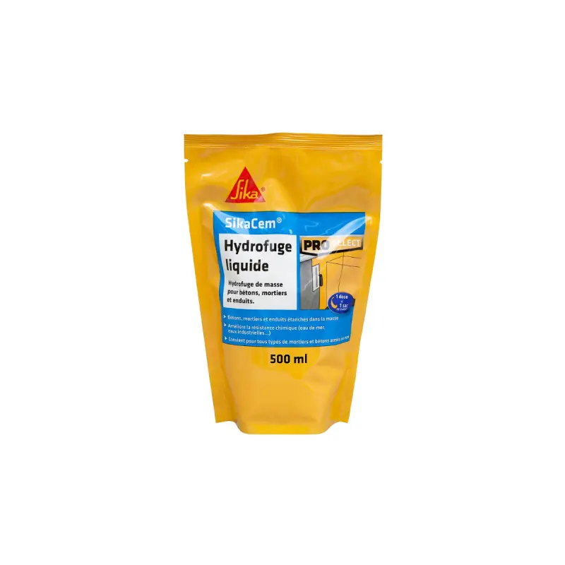 Liquid mass water repellent SIKA SikaCem - For concrete and mortar - 500ML combines with the lime in the cement to form complementary crystallisations that block the capillaries of the mortar, making it waterproof. The product is guaranteed chlorine-free. It has no effect on the setting and mechanical strengths of the concrete.