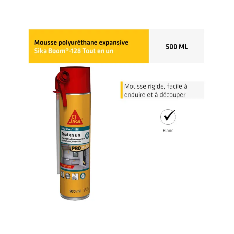 This manual all-in-one expanding foam SIKA - SikaBoom 128 - 500ml is a one-component expanding polyurethane foam. The all-in-one product hardens after extrusion to seal, insulate, and support both indoors and outdoors. Indeed, this foam is ideal as a complement to mechanical fixing around door and window frames. It can be used as an insulator against noise, cold, and draughts. It is also handy for filling hollow spaces in walls, partitions, pipe passages, and around roller shutter boxes and air conditioning systems. The SikaBoom 128 foam is also suitable for static sealing joints. The manual aerosol can be used in any position, but to achieve maximum expanded volume, it is recommended to keep the aerosol upside down during application.