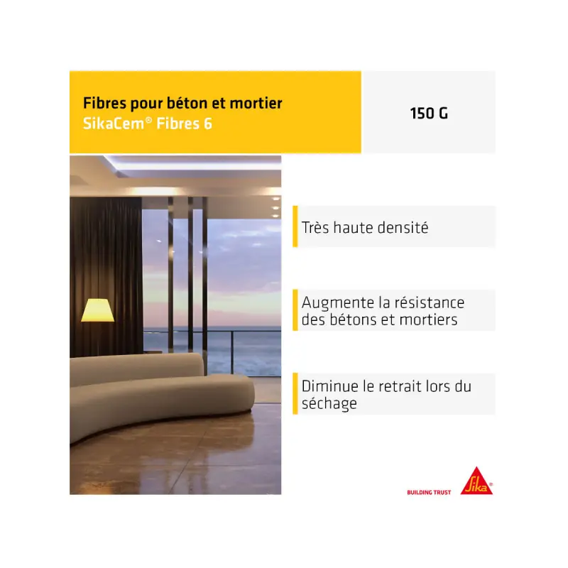 The SIKA SikaCem Fibre 6 - 150g micro-synthetic structural fibres are designed to reduce the risk of early cracking and improve cohesion in the fresh state of concrete and micro-concretes. Depending on the dosage, this fibre can be added to the mesh. The addition of micro-synthetic structural fibres also enhances the impact resistance of concretes.