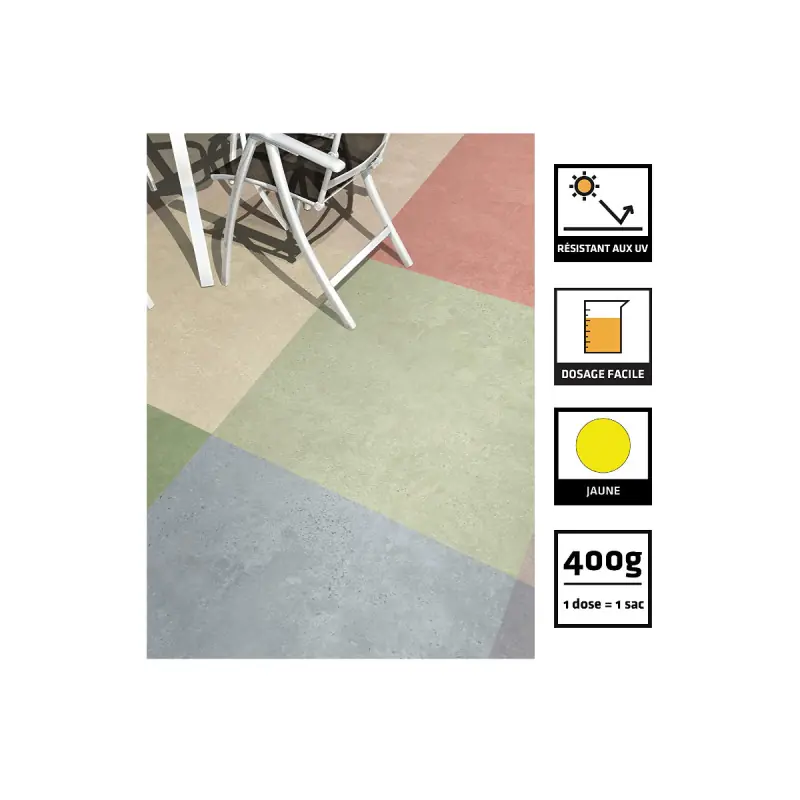 This powder dye for cement, lime, and plaster SIKA SikaCem Color - Yellow - 400g will colour all your concrete, mortar, and coatings. You can easily colour your screed mortars, jointing mortars, concrete slabs, and any other decorative concrete. With SikaCem® Color, a powder dye made from mineral oxides, you achieve a coloured shade with a natural effect for an aesthetic result.