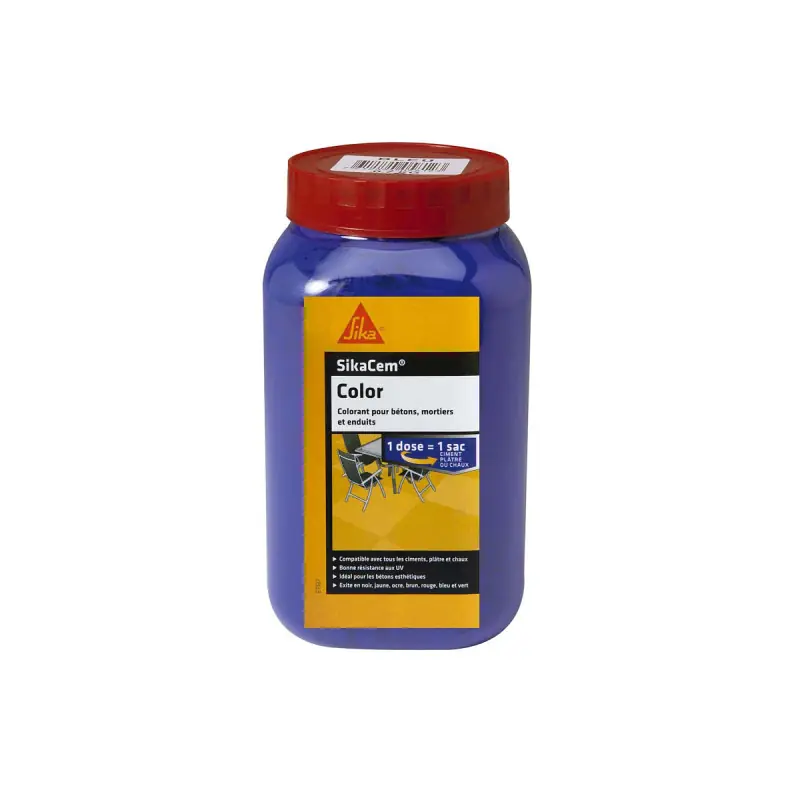 This powder dye for cement, lime, and plaster SIKA SikaCem Color - Blue - 700g will colour all your concrete, mortar, and coatings. You can easily colour your screed mortars, jointing mortars, concrete slabs, and any other decorative concrete. With SikaCem® Color, a powder dye made from mineral oxides, you can achieve a coloured shade with a natural effect for an aesthetic result.