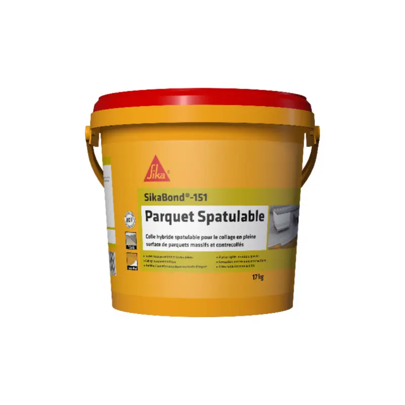 The SIKA elastic adhesive SikaBond-151 Spatula Parquet - 17kg is suitable for bonding most common parquet types, being compatible with all wood species as well as for installation on underfloor heating. This product will surprise you with its ease of application, its rapid curing time, and will help reduce the sound of impact noises.