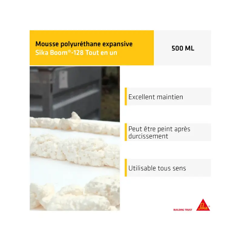 This SikaBoom 128 manual all-in-one expanding foam is a one-component expanding polyurethane foam. The all-in-one product hardens after extrusion to seal, insulate, and support both indoors and outdoors. Indeed, this foam is ideal as a complement to mechanical fixing around door and window frames. It can be used as insulation against noise, cold, and draughts. It is also handy for filling hollow spaces in walls, partitions, pipe passages, and around roller shutter boxes and air conditioning systems. The SikaBoom 128 foam is also suitable for static sealing joints. The manual aerosol can be used in any position, but to achieve maximum expanded volume, it is recommended to keep the aerosol upside down during application.