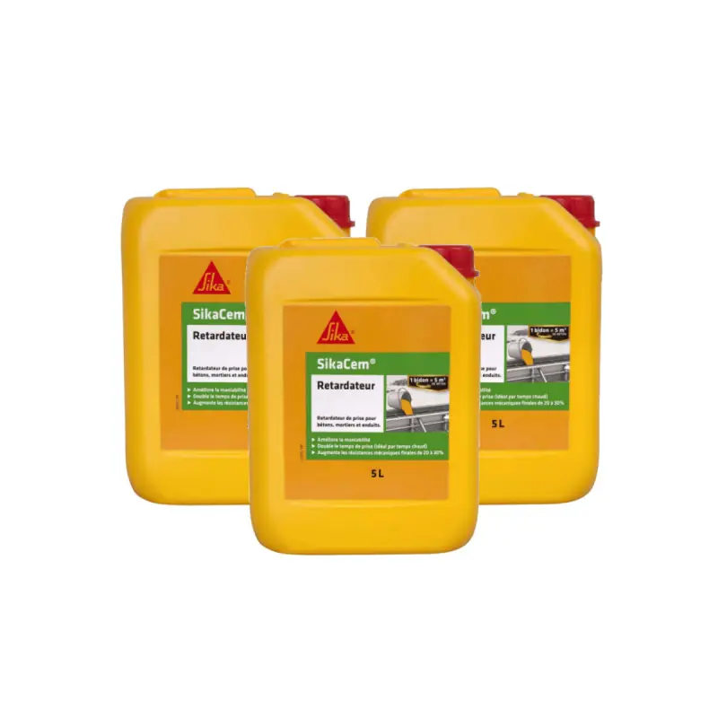 The SIKA SikaCem Retarder for Concrete - 5L is a user-friendly and easy-to-dose product that allows for the delay of concrete setting. It is suitable for use in hot weather for concretes that require a long practical working time and for those that need extended finishing times.