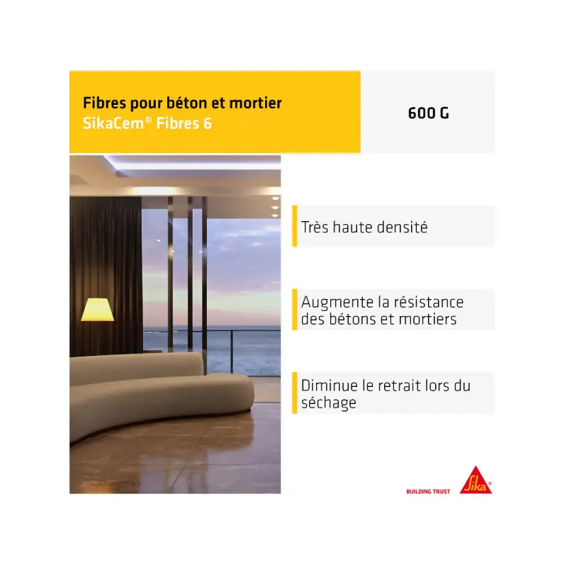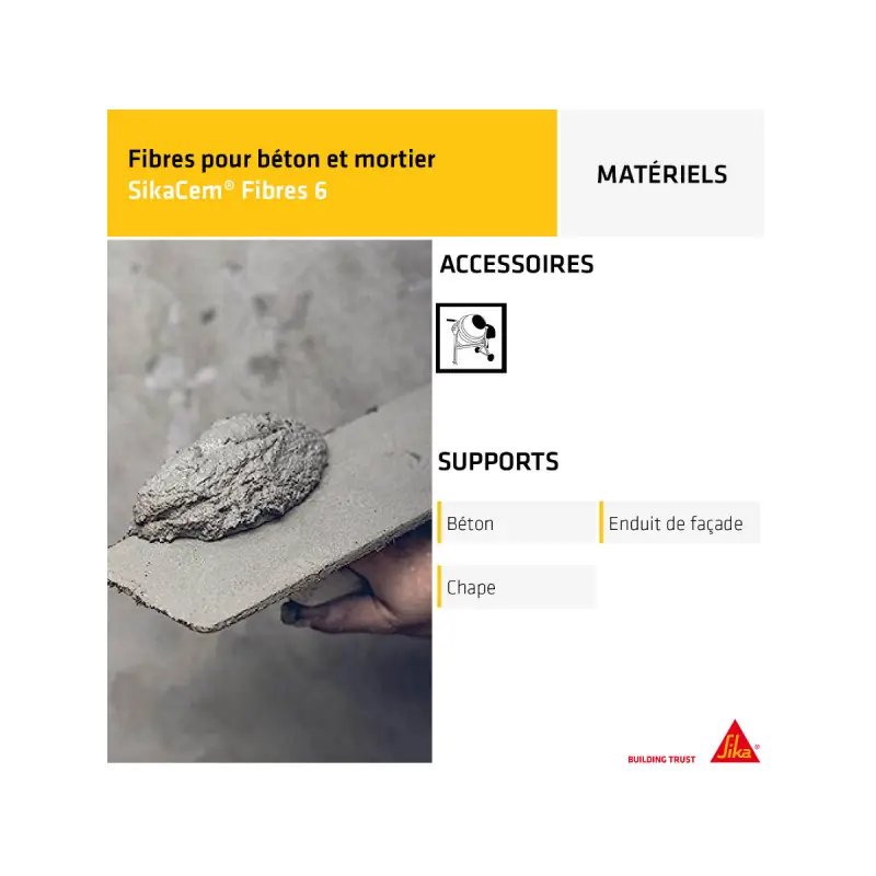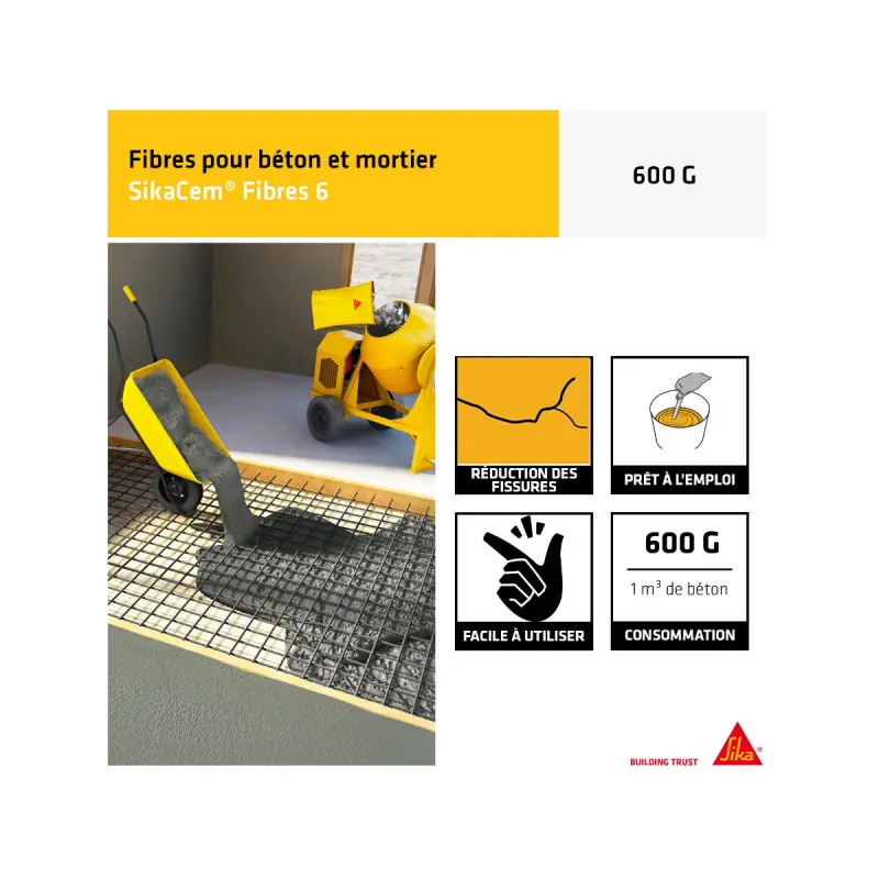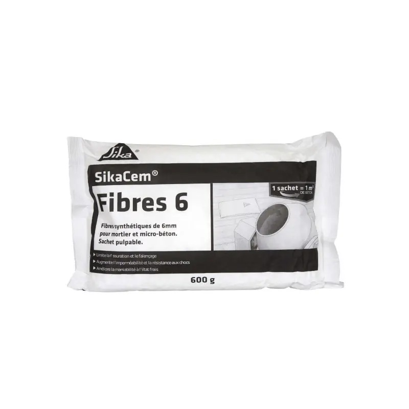 These SikaCem Fibre 6 structural fibres are made of 6mm macro synthetic structural fibre that allows (depending on the dosage) for the reduction or even elimination of structural reinforcements for P4 areas and underfloor heating. The addition of this product improves the ductility of concrete or mortar. The fibres disperse very easily and create a high-density fibrous network within the concrete matrix. Similar to the reinforcements they can replace, this allows for the control of crack opening and propagation by addressing the stresses at their origin. As it is a synthetic fibre, there is no risk of surface rust appearing for elements intended to remain visible. Additionally, this product is packaged in a puck (a bundle of fibres in a water-soluble film) to facilitate dispersion during mixing and to prevent the formation of fibre clumps (urchins) at high dosages. These fibres can be used in floor slabs, screeds, precast elements, or as reinforcement in sprayed concrete.