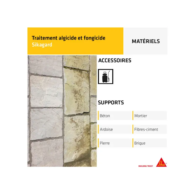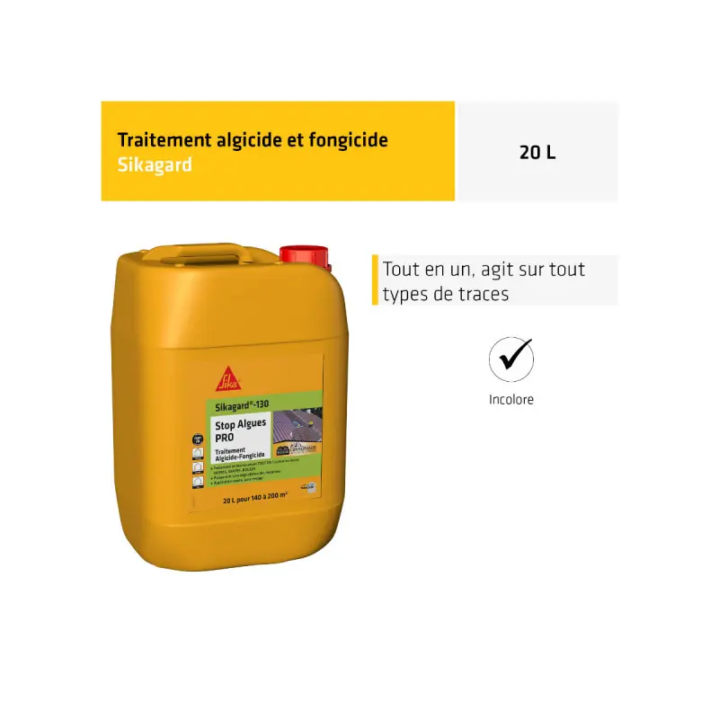 This SIKA algicide and fungicide treatment - Sikagard-130 Stop Algues Pro - 20L is a colourless, odourless liquid ready to use that does not require rinsing. Its professional formula, reinforced with active ingredients, allows for the elimination of dirt and black residues, as well as green and red algae, while limiting their reappearance. It is applied using a low-pressure sprayer from spring to autumn on outdoor surfaces and installations, as well as leisure equipment. Powerful yet non-damaging to materials, it can be applied both horizontally and vertically.