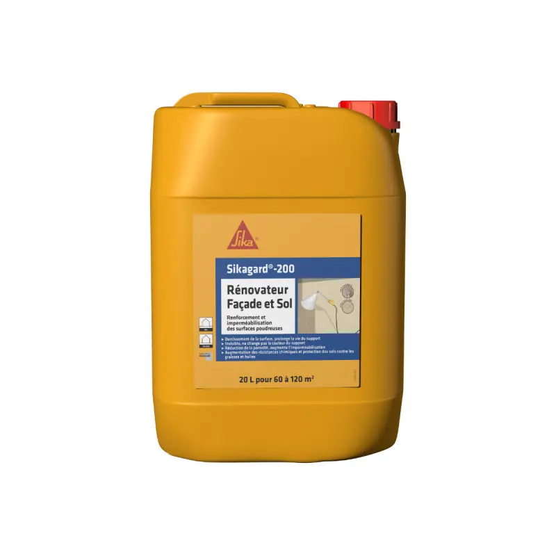 This Sikagard-200 facade and floor renovator is a synthetic resin designed to reinforce porous substrates either to extend their lifespan (substrates becoming powdery and losing their waterproofing) or to enhance their resistance, particularly in aggressive environments (coastal areas, urban zones...). This product is particularly suitable for single-layer renders on facades. It is used outdoors on both vertical and horizontal old (curative treatment) or new (preventive treatment) substrates. It is therefore used for the surface hardening of external hydraulic renders (plaster), limestone stones, cement renders (non-water-repellent), old concrete, screeds, pavings...