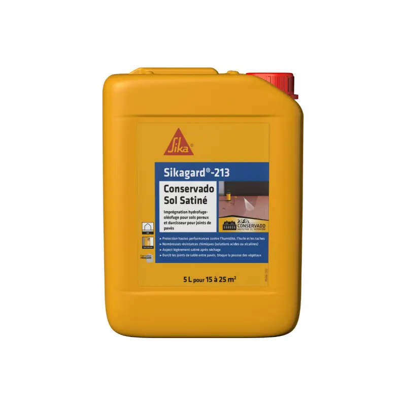 This Sikagard-213 satin floor sealer is a water-repellent and oil-repellent impregnation for porous floors and a hardener for joints between paving stones. It comes as a ready-to-use water-based resin that is UV resistant and particularly suitable for areas with high pedestrian traffic or moderate vehicle traffic: commercial areas, pavements, parking lots, service stations, patios, terraces... It is also an excellent stabiliser for sand joints in paving stones, penetrating deeply into the joint, promoting the stability of the paving stones, and protecting them from infiltration. This sealer effectively waterproofs porous substrates and protects against the penetration of water, oil, and most stains (grease, dirt...).