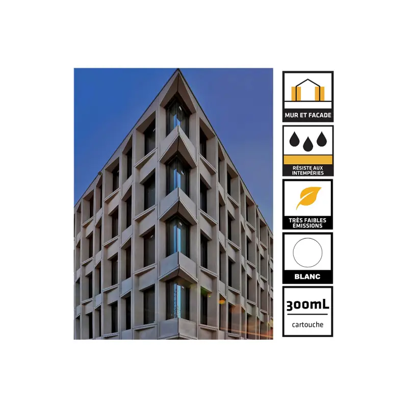 The SIKA SikaHyflex 250 Façade high-performance sealantis easy to apply and easy to smooth. It is ideal for elastic sealing work and expansion joints. Of very good quality and high performance, this product adheres to many substrates and withstands the elements very well for an extended lifespan. This product is rated A+ "very low emissions" on the index of volatile substance emissions in the air presenting a risk of inhalation toxicity on a class scale ranging from A+ (very low emissions) to C (high emissions).