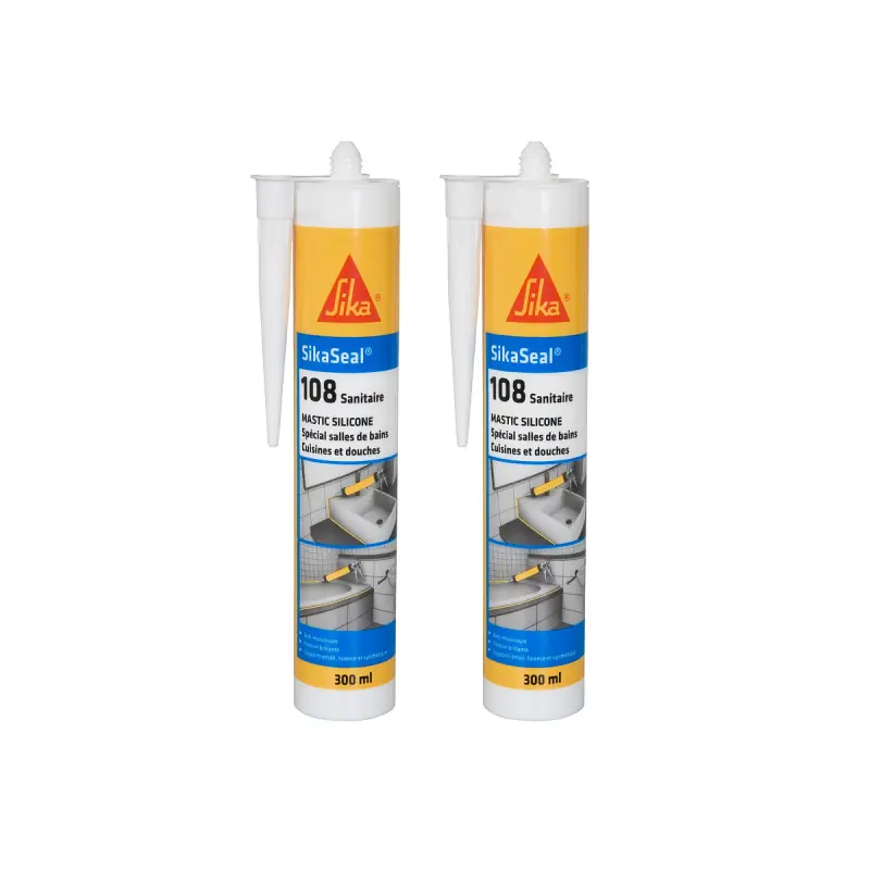 Thispack of 2 SIKA Sikaseal 108 Sanitary anti-mould silicone sealant - White - 300ml is formulated with a biocidal agent for excellent resistance against mould and fungi. It can be used both vertically and horizontally and is perfect for all your sanitary sealing work (sink, bathtub, shower tray, tiles...). This product is a single-component elastomeric sealant based on acetic silicone polymers. It comes in the form of an easily extrudable paste. With rapid polymerisation, it can be used in all orientations! This product is classified A+ "very low emissions" on the index of volatile substance emissions in the air, presenting an inhalation toxicity risk on a scale from A+ (very low emissions) to C (high emissions).