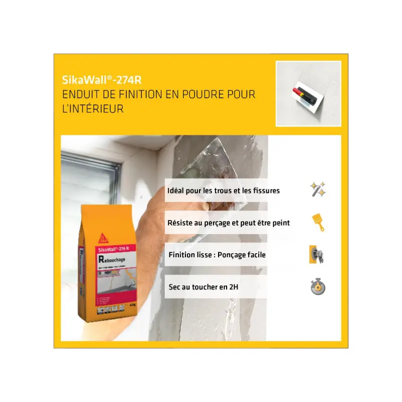 The SIKA SikaWall-274 R Powder Filling Compound - White - 15Kg is a powder-based plaster filling compound to be mixed with water. This product allows for leveling uneven surfaces as well as filling and repairing your walls or ceilings.
