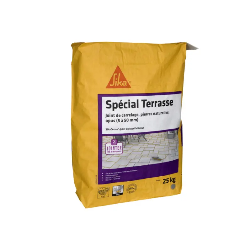 Thisspecial terrace jointing mortar - SIKA SikaCeram - Grey - 25kg - 504038 is ready to use for creating jointsfor ceramic and similar coverings both indoors and outdoors on walls and floors, including water-heated floors. The associated coverings are pressed or extruded stoneware, brick paving, natural stones, and opus. The joint width will be from 5 to 50 mm. This product is classified A+ "very low emissions" on the volatile organic compounds emission index, presenting an inhalation toxicity risk on a class scale ranging from A+ (very low emissions) to C (high emissions).