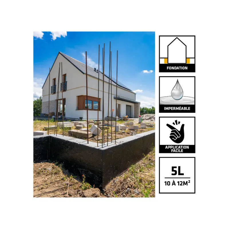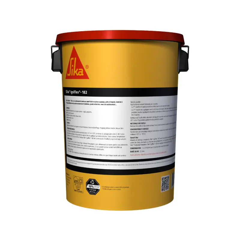 The SIKA Igolflex-183 Foundation Waterproofing Additive - Black - 5L is a high-performance waterproofing coating designed for the protection of foundations, basements, and buried structures. Ideal for construction and renovation sites, the Igolflex-183 creates a durable waterproof barrier against moisture and infiltration, thus extending the longevity of the works. Its excellent adhesion to concrete, masonry, and various substrates ensures optimal protection even in difficult conditions. This ready-to-use, non-bituminous sprayable emulsion is used in conjunction with the Sika Foundation Protection mat.