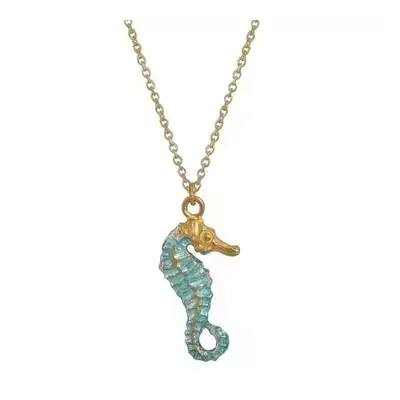Seahorse necklace, made of gold plated silver 925, with turquoise enamel. It can be combined as a set with a small sea urchin pendant, a gold-plated sea urchin double ring and a sea urchin ring in the same colour.