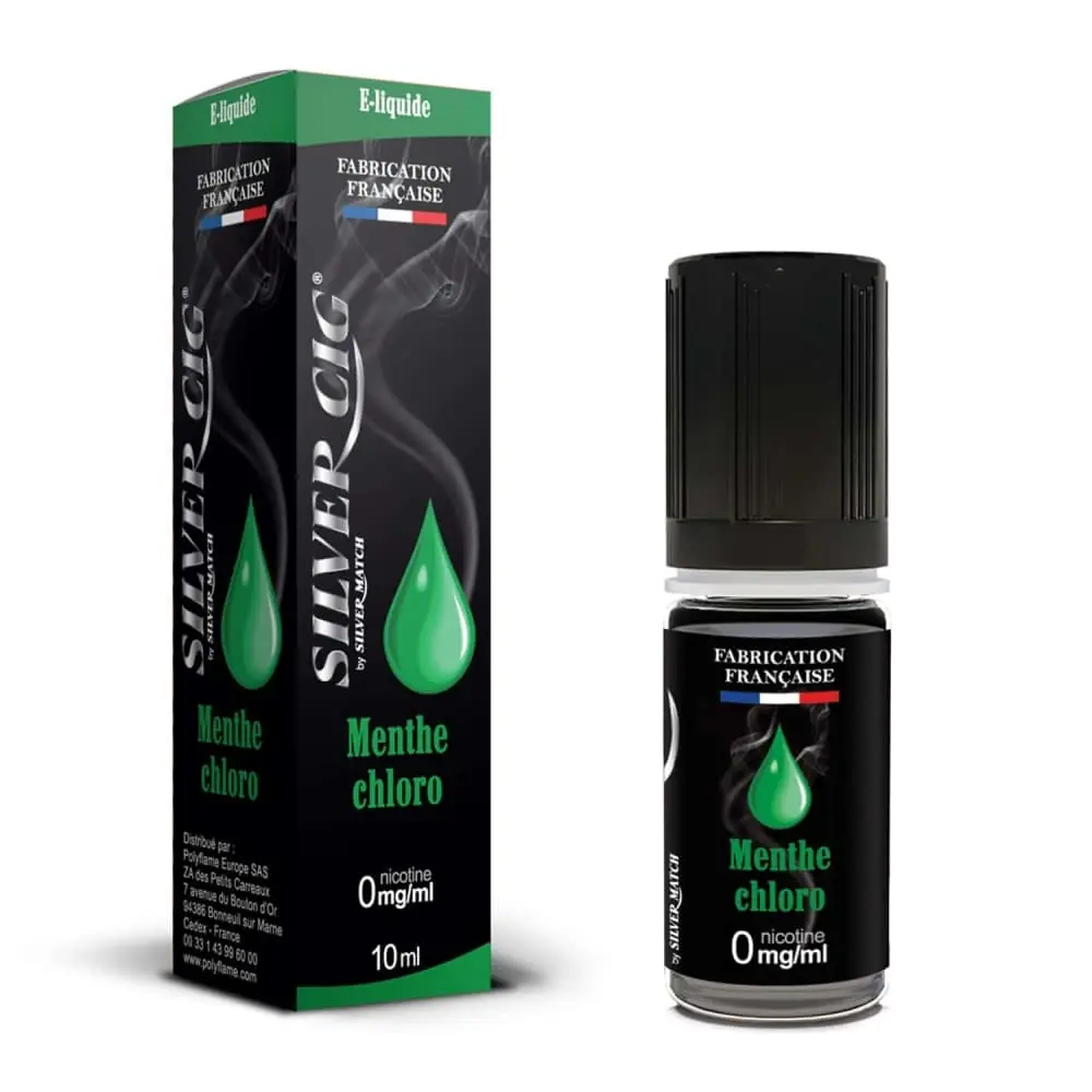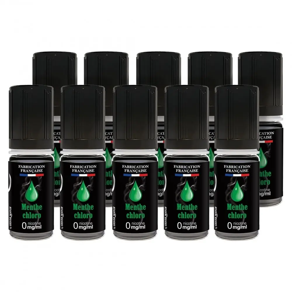 Discover the pack of 10 Silvercig Menthe Chloro 0 mg e-liquids, a sweet and vegetal flavor inspired by chlorophyll mint, ideal for a light and refreshing vape without nicotine.