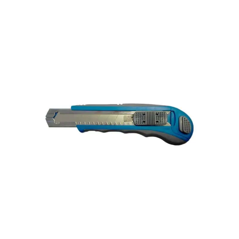 18 mm cutter with a self-retractable blade and adjustable settings via the push button thanks to a quick-change cartridge. Its rubber non-slip handle provides great comfort during use.