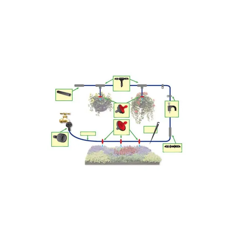 - This system includes: 10 end drippers, 10 integrated drippers, 1 tap connector 3/4" BSP, flow regulator, filter washer, 2 straight connectors, 15 T-connectors, 5 caps, 15 stakes, 10 clips, and 1 hose of 23 metres in vinyl.