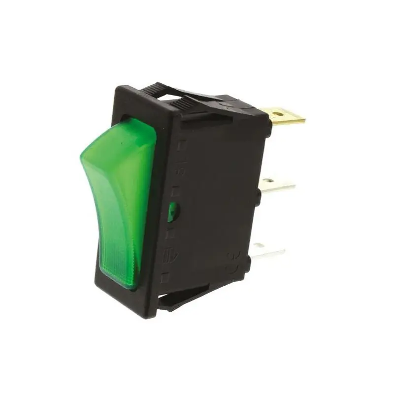 Illuminated single pole rocker switch rated for 20A and 250vDC.