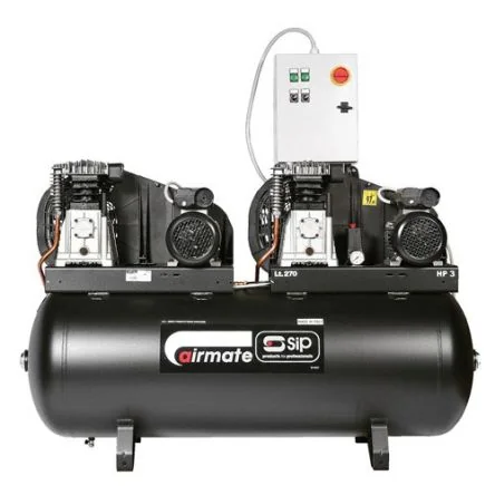 The SIP B3800/270 Tandem is a belt-driven compressor with 2x 3hp motors, meaning that it will continue to operate should a single pump or motor suffer a failure, plus staggered pump start.230v (32amp) input supply 2x 3.0hp (2.2kW) tandem motors Heavy-duty 270 litre air receiver size 32CFM maximum piston displacement 22CFM maximum free air delivery (FAD) 145psi (10 bar) max. working pressure Twin pump units for continued operation should a pump or motor suffer a failure Single or dual running modes available Strong aluminium die-cast valve plate Staggered pump start to reduce draw