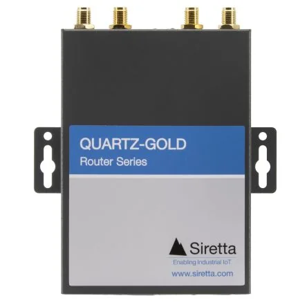 The Siretta QUARTZ-GOLD router is a high performance industrial router designed for transferring large amounts of data via the European LTE Cat 4 cellular network, with dual built in Gigabit Ethernet ports. The QUARTZ-GOLD’s fast data transfer capability reaches up to 150Mbps download and up to 50Mbps upload speed. It also has fall-back to 3G/UMTS communication, should 4G/LTE be unavailable. It is well suited for IoT/mobile broadband applications, offering reliable, secure wireless connectivity.European 4G/LTE bands ARM Cortex A7 900MHz 2 x Gigabit Ethernet ports (100/1000Mb) Strong resistance to electromagnetic interference Built-in watch dog, multi-link detection Small footprint industrial design Excellent temperature endurance -30 to +75 deg C VPN: OpenVPN, PPTP, L2TP, GRE, IPSec WAN failover network redundancy WiFi: 2.4GHz and 5GHz Shock and vibration resistance 2 x LAN, 1 x WAN / 1 x LAN