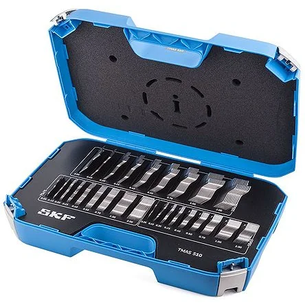 SKF Shim Kit, Stainless Steel - TMAS 510 Ensure accurate adjustments with these single-slot stainless steel shims. The kit offers a comprehensive range of shim thicknesses, so you can find the exact piece that you need to align your machine parts or fill gaps between objects. Each piece has been fully de-burred, removing imperfections from the surface to allow for the most precise alignment possible. The thickness is clearly marked on each shim, so youll be able to find the one youre looking for quickly and easily.• Shim kit containing 510 pieces • High-quality stainless steel (grade 304S31) for maximum durability • Widths of 50 mm, 75 mm, 100 mm • Lengths of 50 mm, 75 mm, 100 mm • Thicknesses of 0.05 mm, 0.1 mm, 0.2 mm, 0.25 mm, 0.4 mm, 0.5 mm, 0.7 mm, 1 mm, 2 mm • Kit includes case with handle for practical transportation and storage Application Information • Industrial applications • Manufacturing equipment • Precise alignment of masonry, carpentry, metalworking parts • Fine craftsmanship and luthiery • Vehicle repair How can I use stainless steel shims? You can wedge the shims into a small gap by hand, or use a hammer or mallet if you need more force. Remove them with pliers or similar tools.