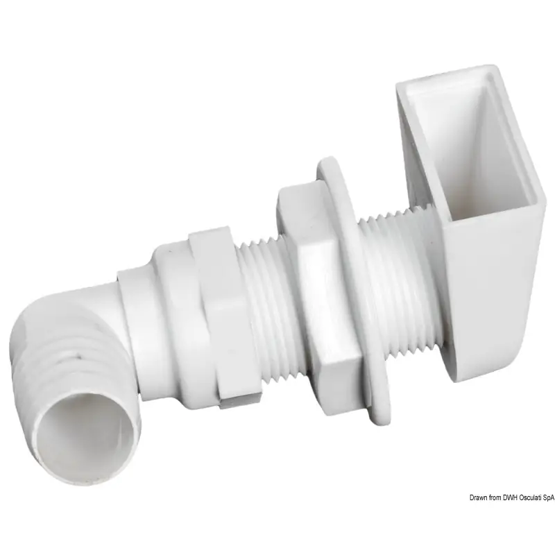 Durable white plastic scupper with a 90° hose adaptor for efficient drainage.